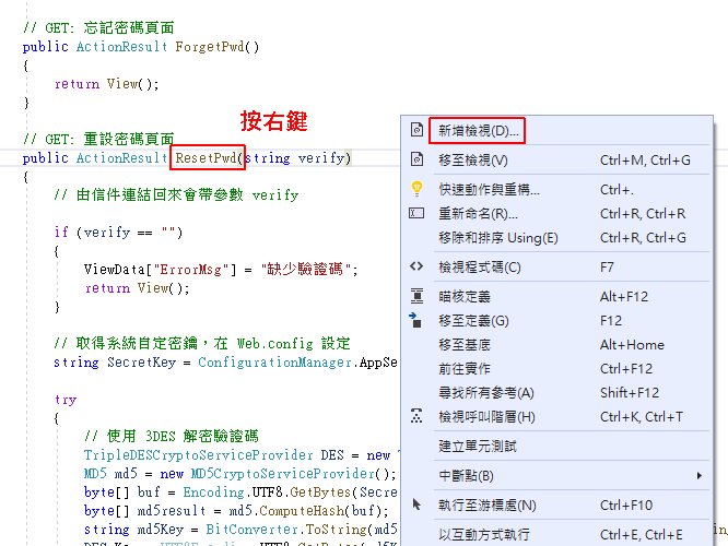 在 ResetPwd() 語法上按右鍵選「新增檢視」。