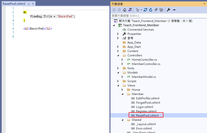 新增之後在 Views\Member\ResetPwd.cshtml 會新增 View 檢視頁面。