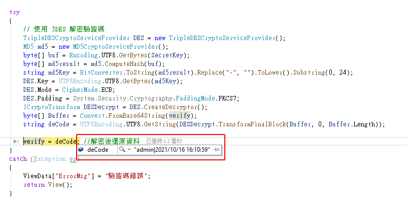 在 ResetPwd(string verify) 的方法內會解密驗證碼,就會取得原始資料。