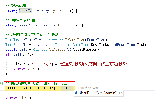 在傳入的參數中沒有包含帳號,而是從 Session[“ResetPwdUserId”] 取出帳號,是比較安全的做法,把重要的資訊存在 Session 中取用,可以避免前端由駭客傳入假資料,導致修改到別人的密碼。