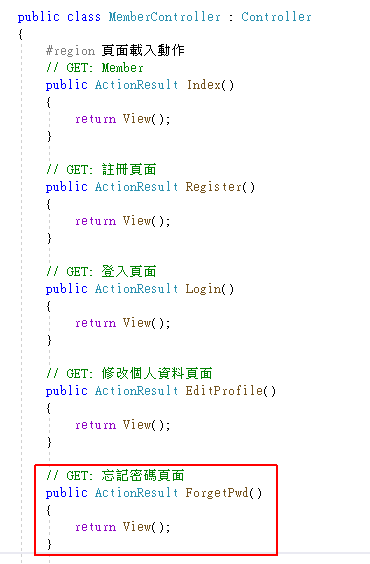 這裡要新增一個忘記密碼的畫面,在 \Controllers\MemberController.cs 類別內,增加 ForgetPwd() 方法然後 Return View()。