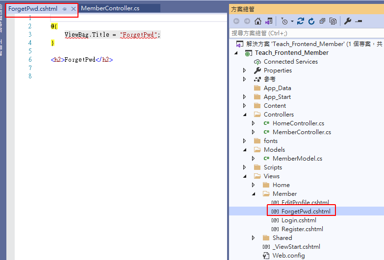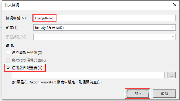 新增之後在 Views\Member\ForgetPwd.cshtml 會新增 View 檢視頁面。