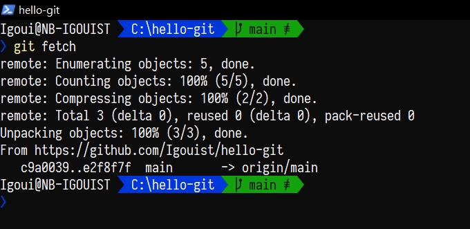 現在遠端儲存庫已經有了一個變更,但是我們本機還不知道呢!接著就讓我們實際操作一下,首先我們需要取得遠端的資訊,這時候就可以用 fetch