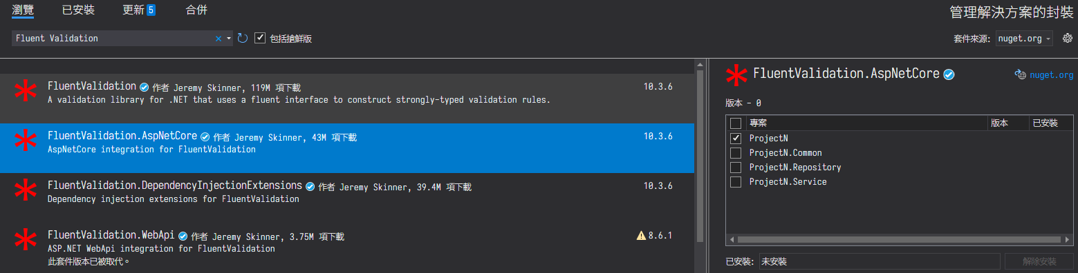 因為我們的示範專案是 .net Core 的 Api,所以讓我們安裝 FluentValidation.AspNetCore