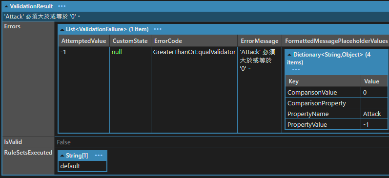 雖然內建的驗證規則都有提供制式的回傳訊息,例如對 Attack 做 .GreaterThanOrEqualTo(0) 驗證失敗時,會得到「‘Attack’ 必須大於或等於 ‘0’」的訊息