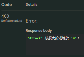 這邊直接使用先前建置好的 Swagger 頁面來測試,並且故意把攻擊力打成負數: