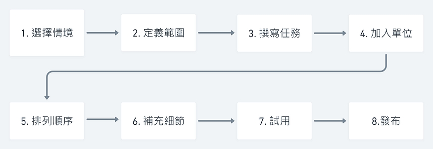 有了第一版流程圖之後,就可以先把其他項目補上—「6.補充細節」,就是將任務用文字來描述細節,並補充一些圖像、教學畫面、需要的周邊文件。